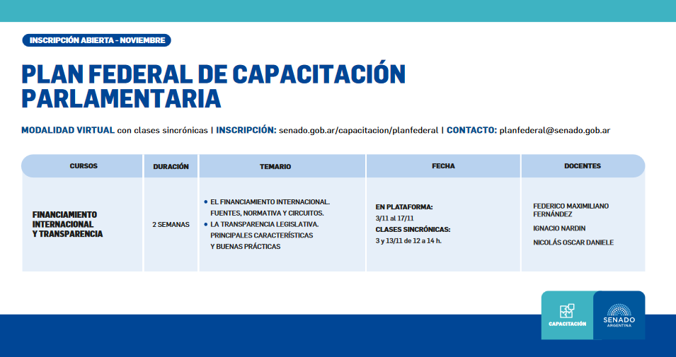 En el marco del Plan Federal de Capacitación Parlamentaria, impulsado por el Honorable Senado de la Nación, compartimos la oferta de capacitaciones correspondiente al mes de noviembre.